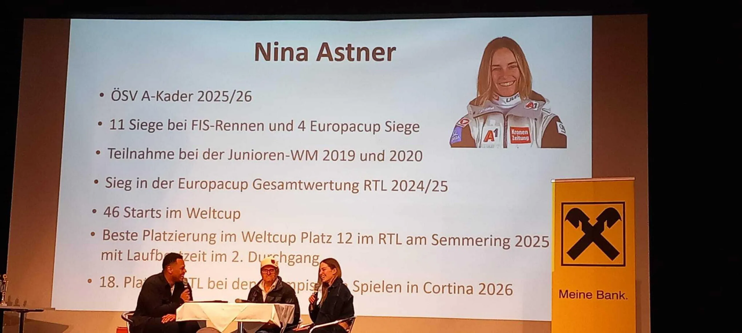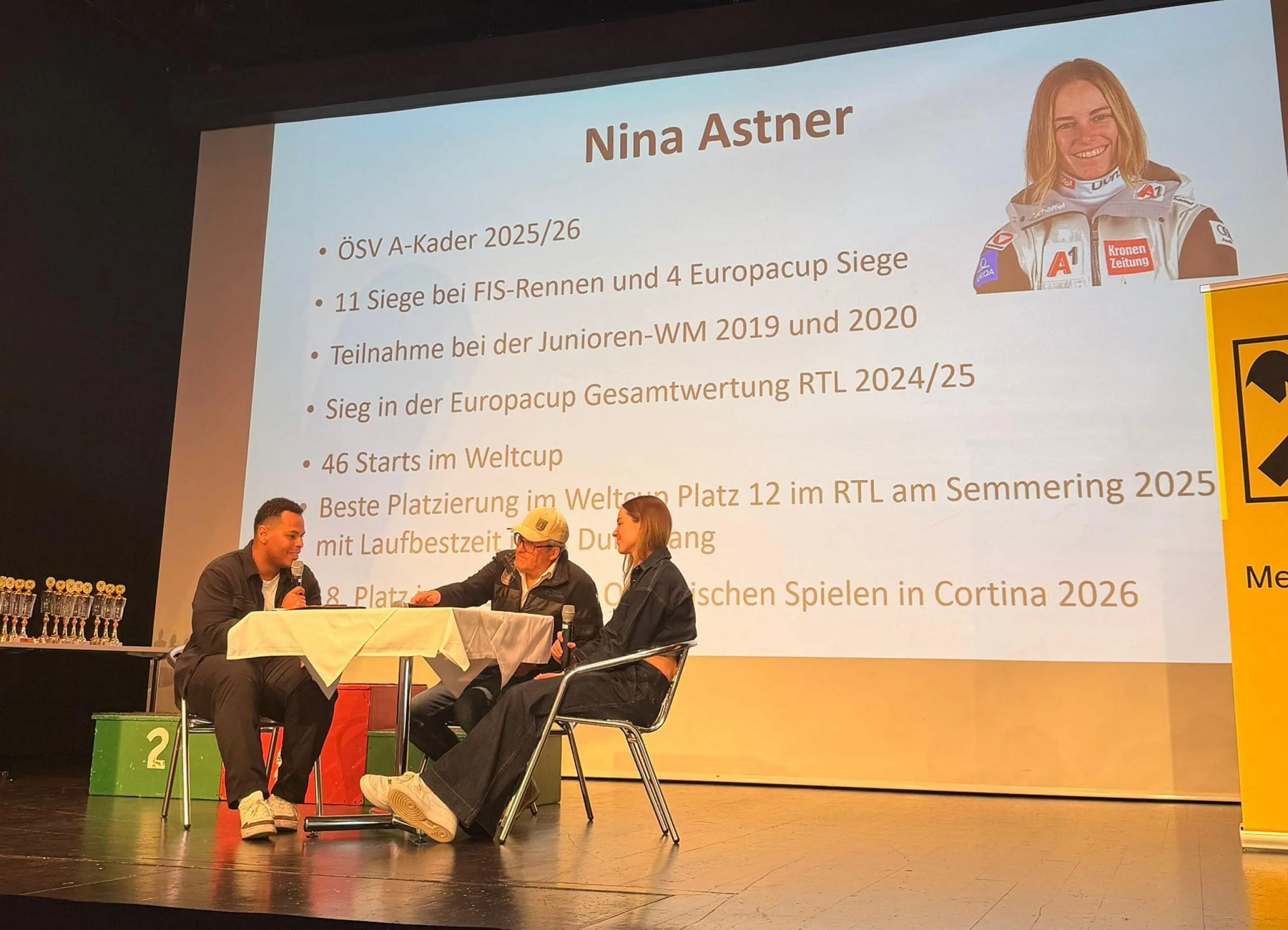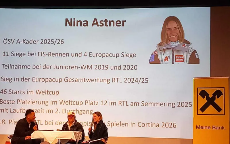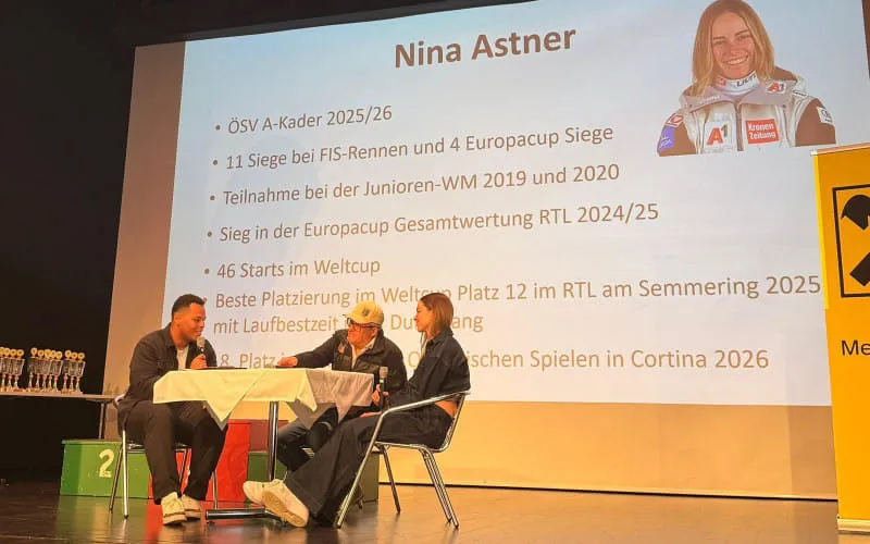 Nach den Grußworten von Bezirksobmann Josef Hirzinger sowie weiteren Offiziellen folgte ein unterhaltsames Interview mit der Riesenslalom-Spezialistin Nina Astner vom SC Itter. Schwungvoll und charmant gewährte die Olympiateilnehmerin spannende Einblicke in den Alltag einer ÖSV-Rennläuferin. Im Anschluss überreichte sie die prächtigen Trophäen an die besten Nachwuchsrennläuferinnen und -rennläufer des Bezirks. Die ersten fünf jedes Jahrgangs wurden mit Pokalen ausgezeichnet, die Plätze sechs bis zehn erhielten Medaillen.